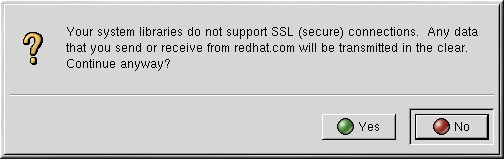 The opening screen for the Red Hat Network Registration Client provides a brief overview of the services available and the steps required to register (see Figure 5.4, “Welcome Screen”). Click to continue with the registration process. If you click , the registration process ends and no information is sent.