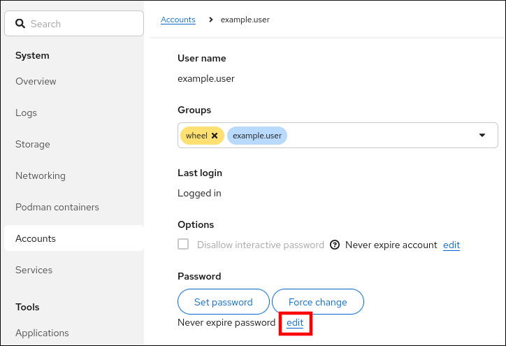By default, user accounts have set passwords to never expire. You can set system passwords to expire after a defined number of days. When the password expires, the user must change its password at the next login attempt before the user can access the system.