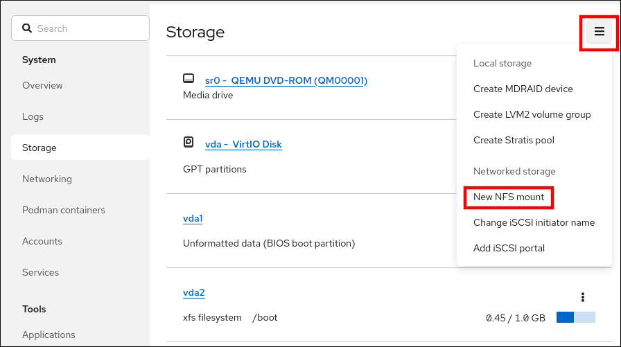 cockpit-storagedpackage is installed on your system. - An NFS mount is added to your system.