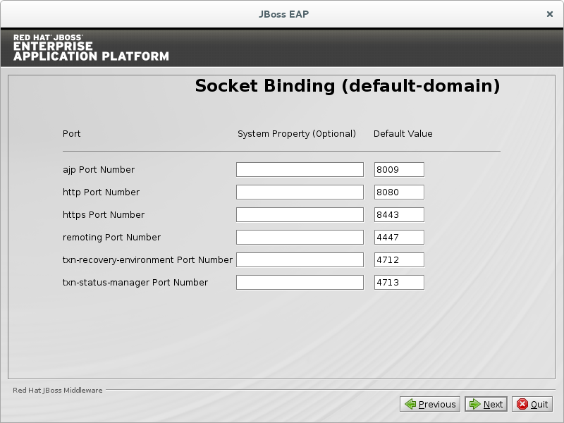 Figure B.16. Configuration des Liaisons de sockets du programme d'installation de JBoss EAP (Domaine par défaut)