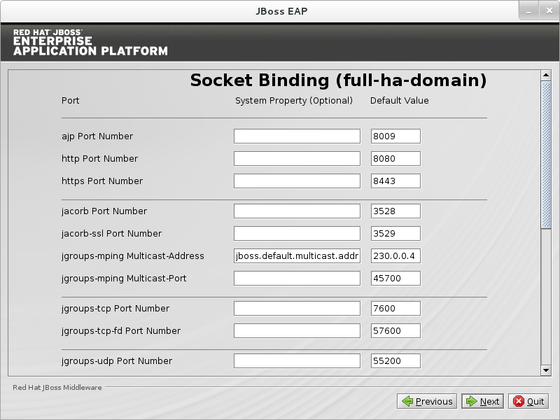 Figure B.18. Configuration des Liaisons de sockets du programme d'installation de JBoss EAP (Domaine Full)