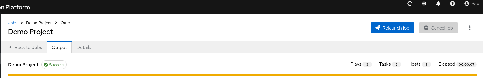 The relaunch operation only applies to relaunches of playbook runs and does not apply to project or inventory updates, system jobs, and workflow jobs. When a job relaunches, the Output view is displayed. Selecting any type of job also takes you to the Output view for that job, where you can filter jobs by various criteria: