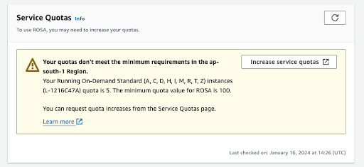 - Cliquez sur le bouton Augmenter les quotas de service ou utilisez le lien En savoir plus pour obtenir plus d’informations sur la façon de gérer les quotas de service. Dans le cas d’un quota insuffisant, notez que les quotas sont spécifiques à la région. Dans le coin supérieur droit de la console Web, vous pouvez utiliser le commutateur de région pour redémarrer la vérification des quotas pour n’importe quelle région qui vous intéresse, puis soumettre des demandes d’augmentation de quota de service au besoin.