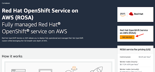 Activez le ROSA avec le produit HCP sur la page de la console AWS en cliquant sur le bouton Démarrer: