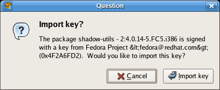 Se usate Package Updater per la prima volta il programma vi richiederà di importare la chiave di sicurezza GPG di Red Hat, la quale verifica che il pacchetto è stato firmato ed è certificato per Red Hat Enterprise Linux.