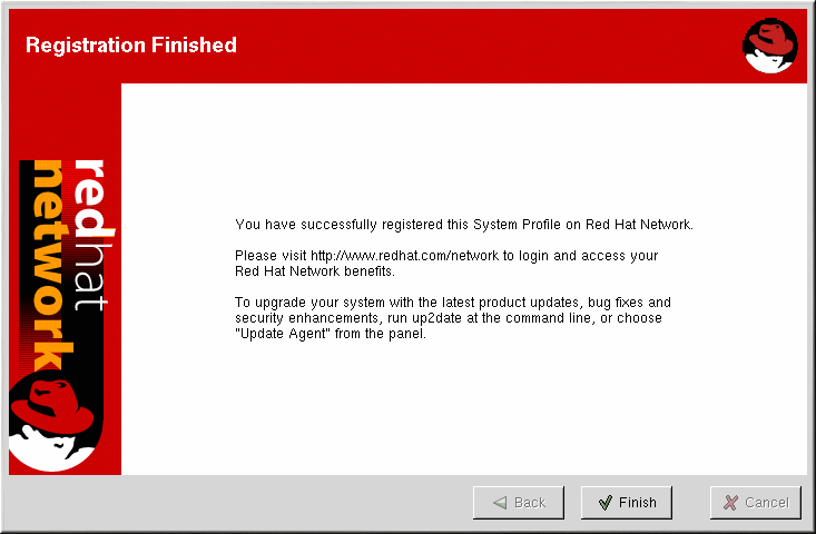 Come visto in Figura A.12, «Termine della raccolta di informazioni per il Profilo del sistema», l'ultima fase della registrazione consiste nel confermare se desiderate inviare il vostro Profilo a Red Hat Network. Se a questo punto scegliete , nessuna informazione verrà inviata. Facendo clic su il vostro Profilo di RHN verrà registrato.