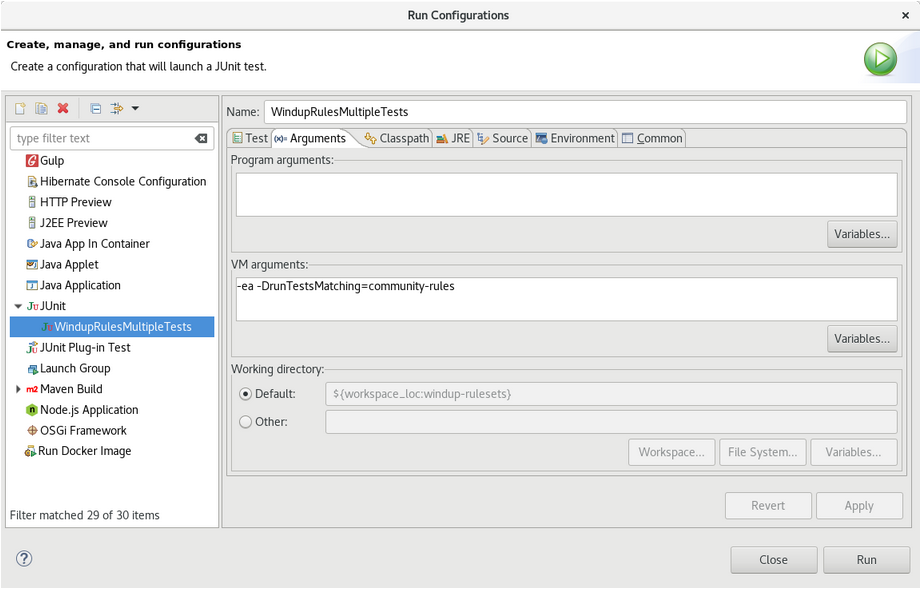 -DrunTestsMatching=<RULE_NAME>仮想マシン引数を追加します。たとえば、ルール名がcommunity-rulesであった場合は、以下のイメージのように-DrunTestsMatching=community-rulesを追加します。右下隅の Run をクリックしてテストを開始します。