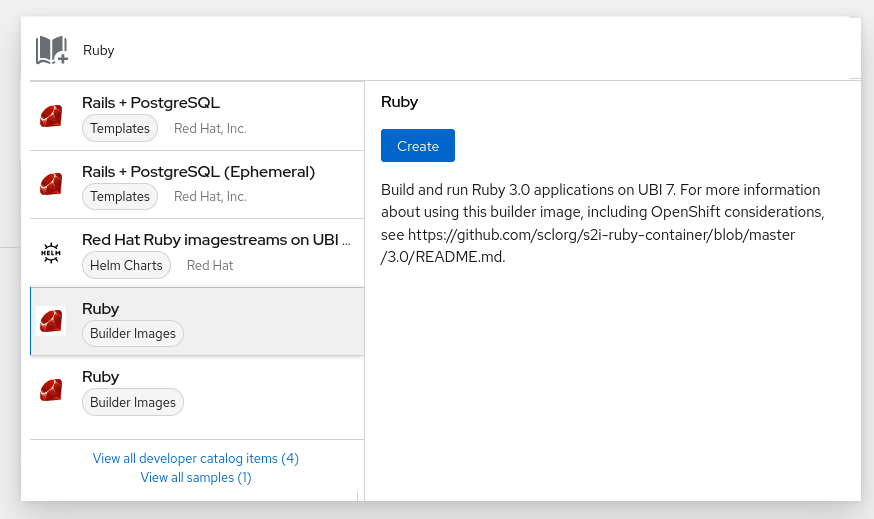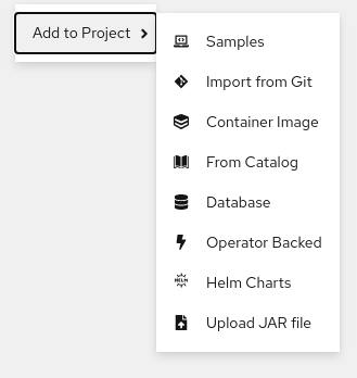 ) のいずれかを使用して、アプリケーションを作成できます。プロジェクトに追加するアプリケーションは、Git、JAR ファイル、devfile、または開発者カタログから入手できます。
