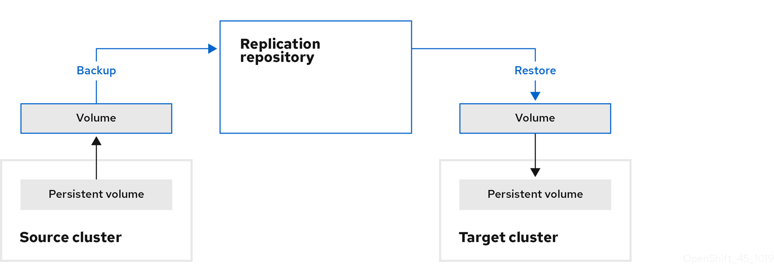 MTC は、データファイルをソースクラスターからレプリケーションリポジトリーにコピーし、そこからターゲットクラスターにコピーします。