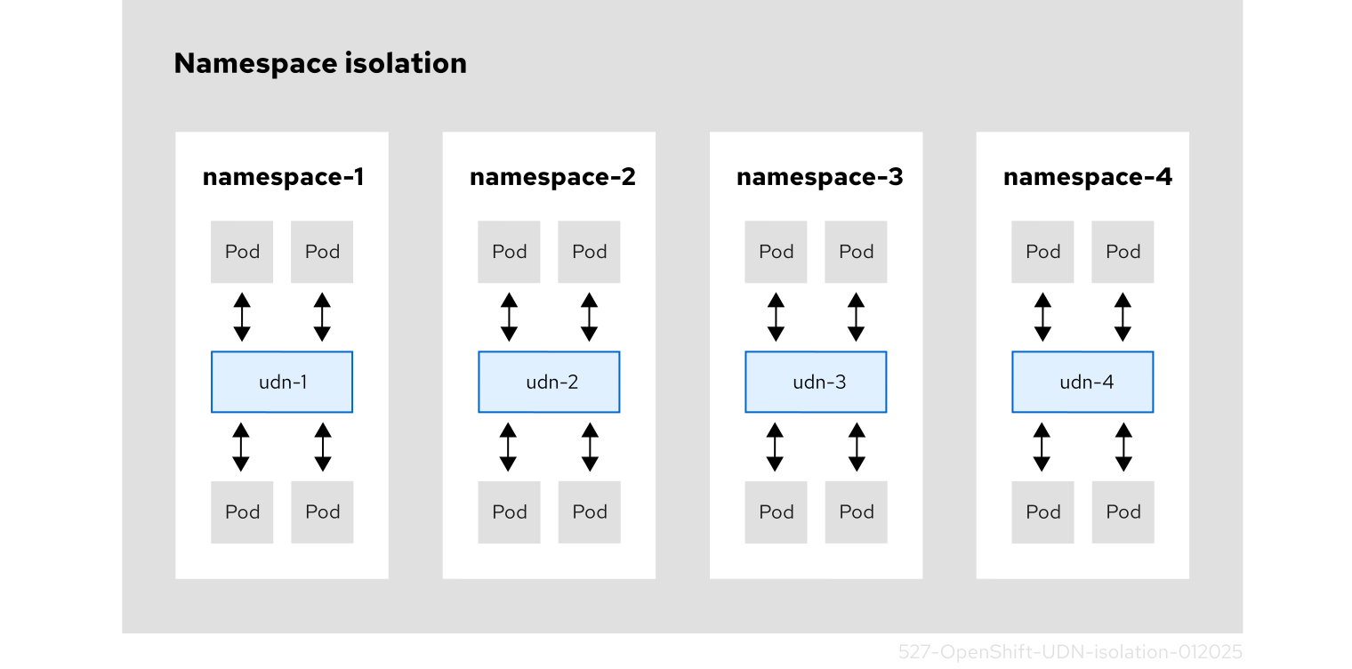 - 複数のネットワークのサポート: ユーザー定義のネットワーク機能により、管理者は複数の namespace を単一のネットワークに接続したり、異なる namespace セットごとに個別のネットワークを作成したりできます。