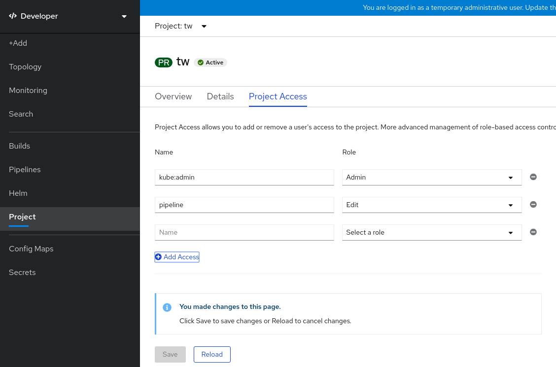 2.1.3. Developer パースペクティブを使用したプロジェクトに対するアクセスパーミッションの提供 リンクのコピーリンクがクリップボードにコピーされました!