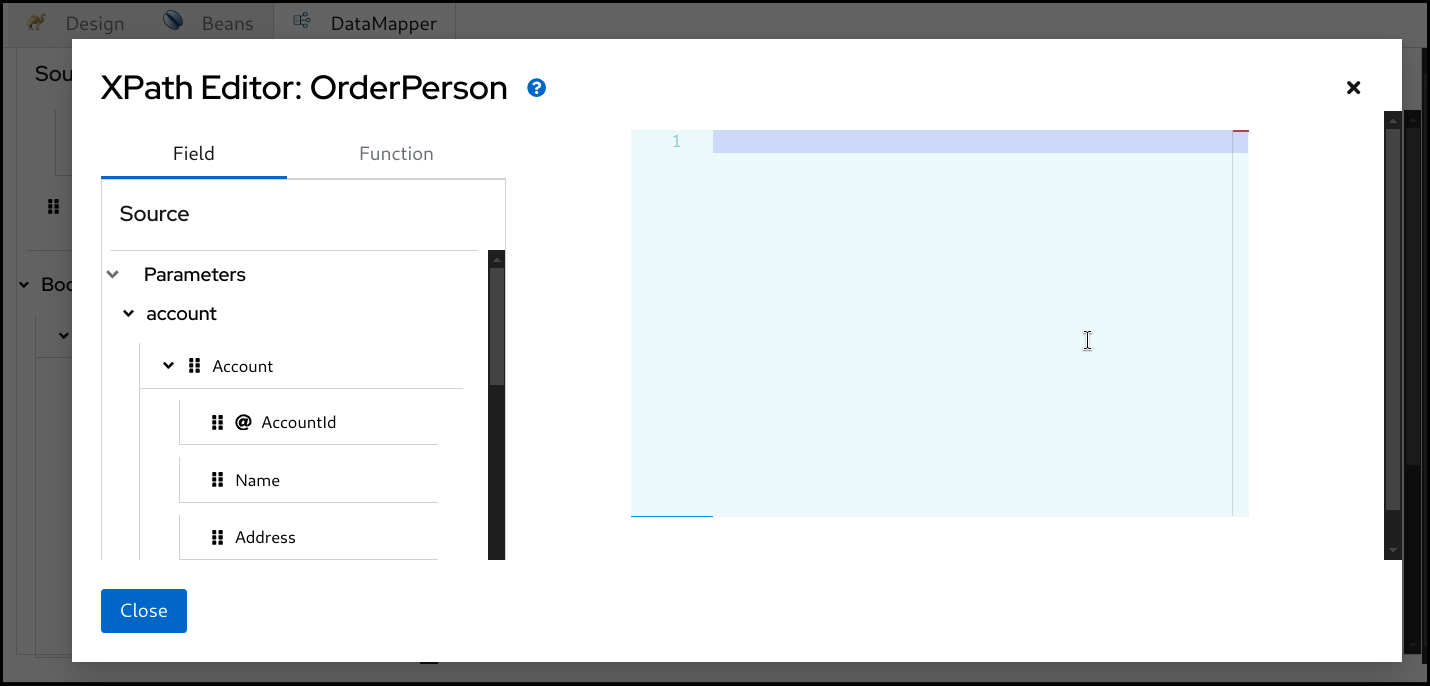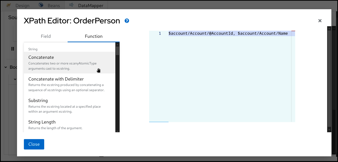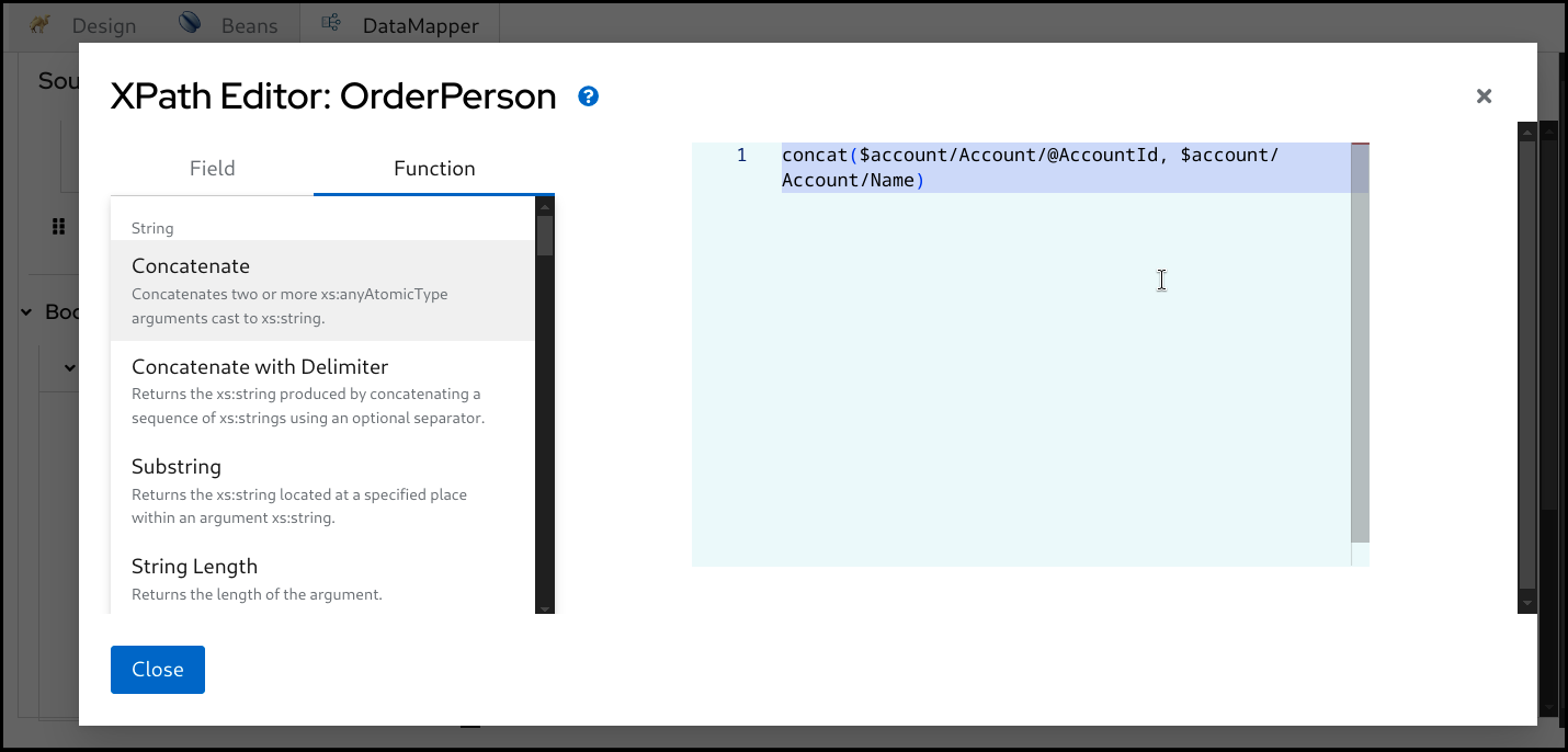 FunctionタブからXPath関数をドラッグアンドドロップすることもできます。関数をドラッグしてエディターにドロップします。