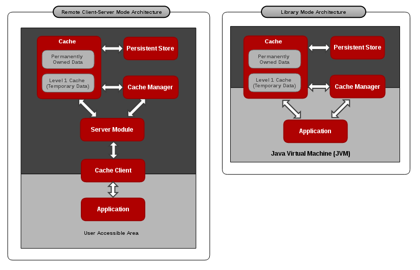 - 図の濃い灰色部分にあるのは、ユーザーが直接対話できない要素です。リモートクライアントサーバーモードでは、永続ストア、キャッシュ、キャッシュマネージャー、1 次キャッシュ、およびサーバーモジュールが含まれます。ライブラリーモードでは、ユーザーは永続ストアおよび 1 次キャッシュと直接対話できません。