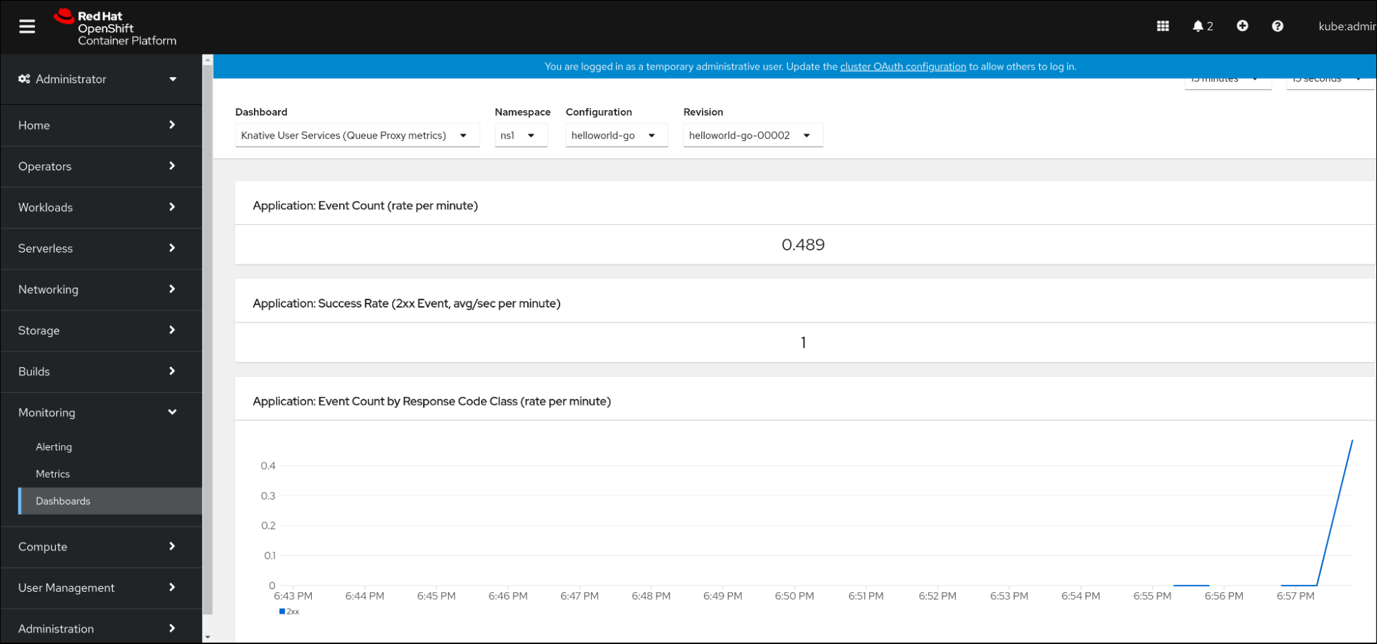 Knative User Services (Queue Proxy metrics)ダッシュボードを選択します。 - アプリケーションに対応する Namespace、Configuration、および Revision を選択します。