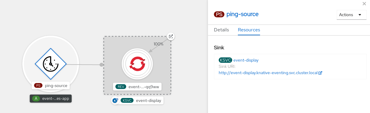 http://event-display.svc.cluster.localのsvcは、シンクが Knative サービスであることを判別します。他のデフォルトのシンクの接頭辞には、channelおよびbrokerが含まれます。