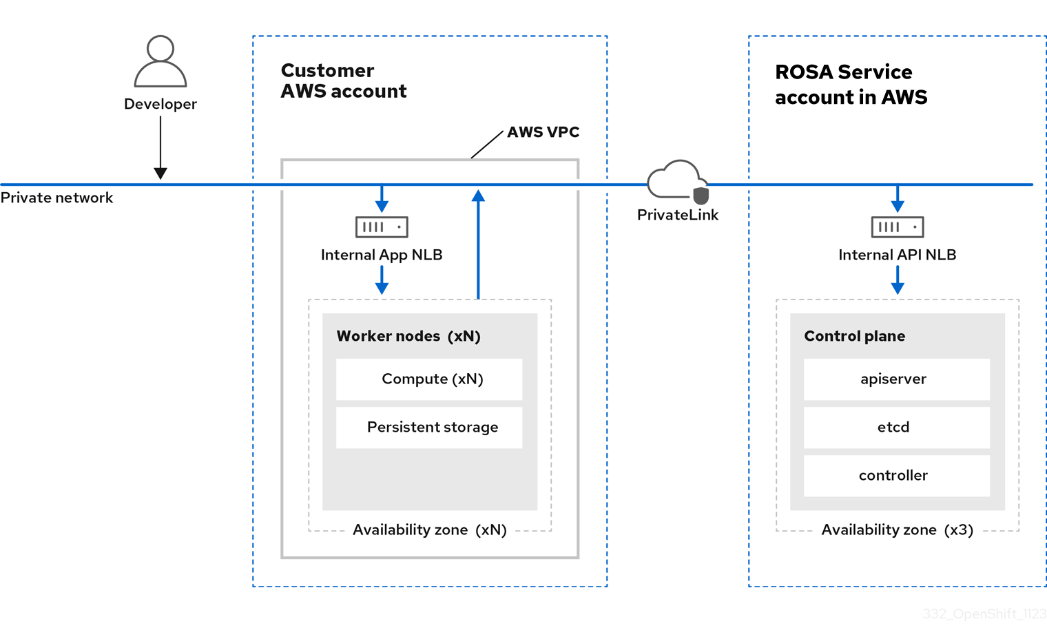 Red Hat OpenShift Service on AWS の機能の 1 つで、データプレーンとワーカーから Red Hat OpenShift Service on AWS クラスター上でコントロールプレーンをホストできるようになります。このモデルは次のアクションを実行します。