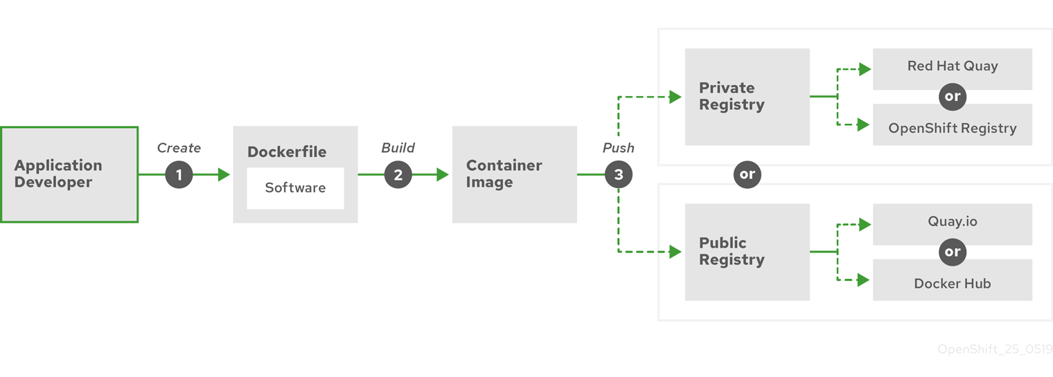 - Red Hat OpenShift Service on AWS は、コンテナーイメージレジストリー API を実装する任意のサーバーをイメージのソースとして使用できます。これにより、開発者はプライベートコンテナーイメージをプッシュおよびプルできます。