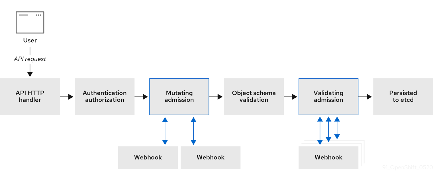 Red Hat OpenShift Service on AWS のデフォルト受付プラグインのほかに、受付チェーンの機能を拡張するために Webhook サーバーを呼び出す Webhook 受付プラグインを使用して動的な受付を実装できます。Webhook サーバーは、定義されたエンドポイントにて HTTP で呼び出されます。