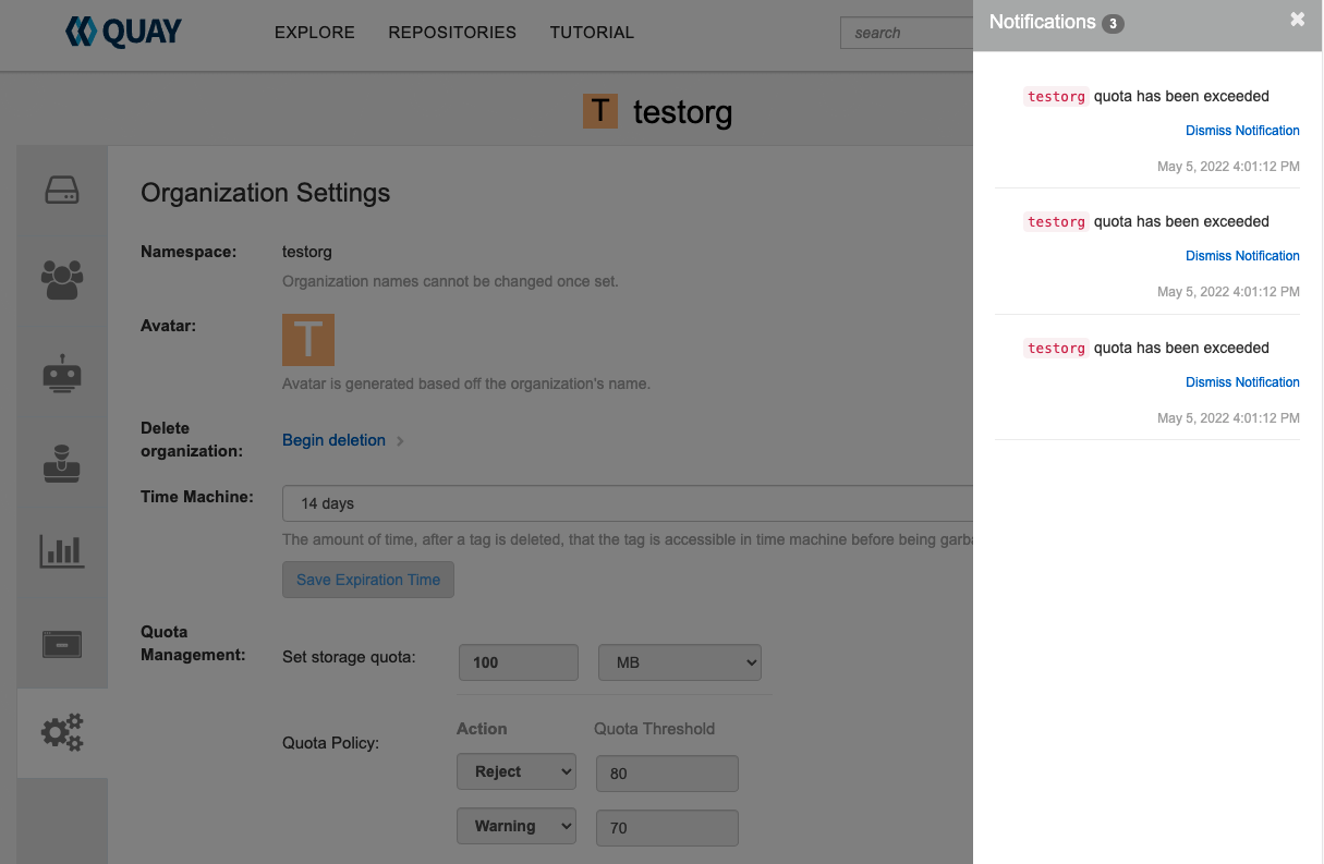 既存の割り当てを変更する (ここでは 10MB から 100MB に) には、データを /api/v1/organization/{orgname}/quota/{quota_id} エンドポイントに PUT します。