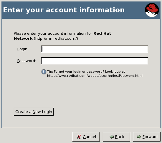 アカウント情報の入力 ページではユーザーに RHN ログイン 情報の入力 (情報がある場合) またはログインがない場合は新規アカウントの作成が求められます。 新規の RHN アカウントを作成するには、「新規アカウントの作成」ボタンを押します。 アスタリスク (*) が付いているフィールドに入力を行います。 また、 その他、 必要と思われる情報があればそれも入力します。 「新規ログインの作成」ボタンを押して新しいログインを作成します。