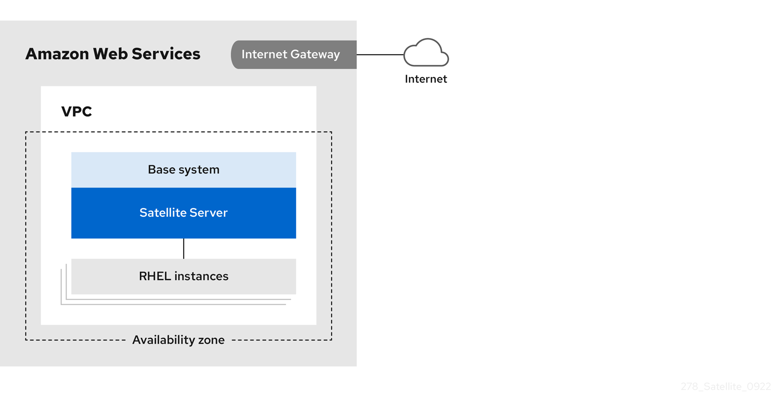 これは、AWS の Satellite の設定で最も複雑性が低い設定です。Satellite Server とホストの両方を同じリージョン内および Virtual Private Cloud (VPC) 内にデプロイします。別のアベイラビリティーゾーンを使用することもできます。