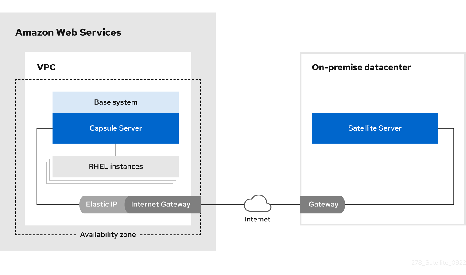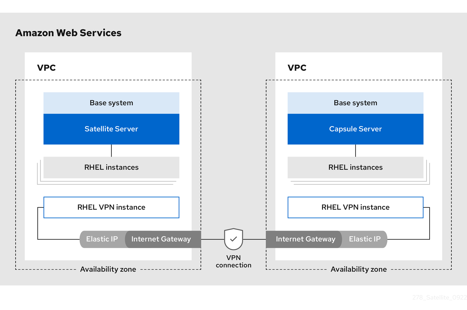 オンプレミスのロケーションと、Capsule Server が配置されている AWS リージョンの間に VPN 接続を作成します。Capsule を実行するインスタンスを登録すれば、Satellite Server の外部のホスト名を使用することも可能です。