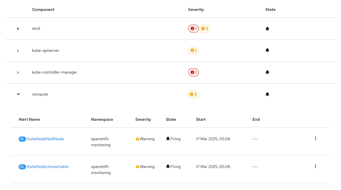 다음 알림 목록에서 알림은 심각도별로 그룹화된 특정 구성 요소에 매핑됩니다.