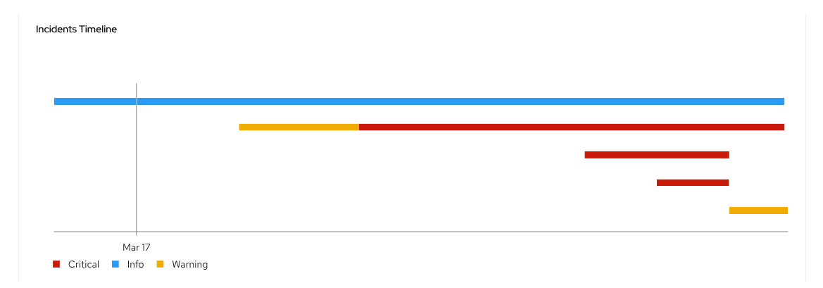 클러스터 관찰 운영자 사고 감지 기능은 관련 알림을 사고 로 그룹화합니다. 이러한 사건은 심각도에 따라 색상으로 구분된 타임라인으로 시각화됩니다. 알림은 심각도별로 그룹화된 특정 구성 요소에 매핑되므로, 먼저 영향이 큰 구성 요소에 집중하여 근본 원인을 파악하는 데 도움이 됩니다. 그런 다음 사고 타임라인에서 개별 알림까지 세부적으로 살펴보면서 기본 문제를 해결하는 방법을 확인할 수 있습니다.