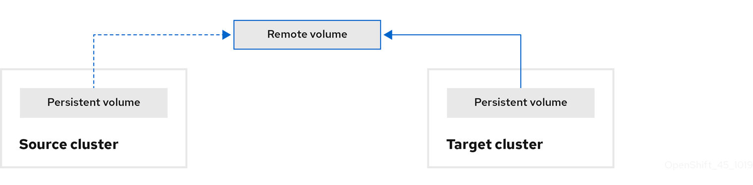 이동: MTC는 소스 클러스터에서 원격 볼륨(예: NFS)을 마운트 해제하고 원격 볼륨을 가리키는 대상 클러스터에 PV 리소스를 만든 다음 대상 클러스터에 원격 볼륨을 마운트합니다. 대상 클러스터에서 실행되는 애플리케이션은 소스 클러스터와 동일한 원격 볼륨을 사용합니다. 소스 및 대상 클러스터가 원격 볼륨에 액세스할 수 있어야 합니다.