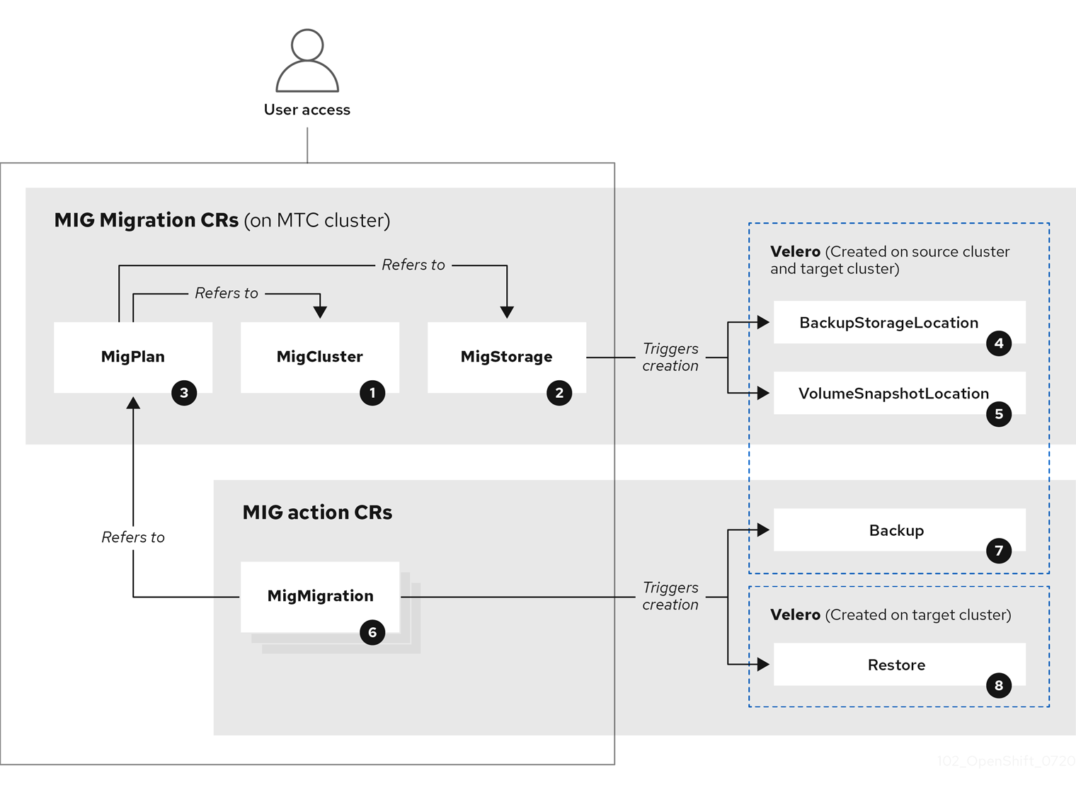 MigMigration (작업, MTC 클러스터): 데이터를 준비하거나 마이그레이션할 때마다 마이그레이션이 생성됩니다. 각 MigMigration CR은 MigPlan CR과 연결되어 있습니다.