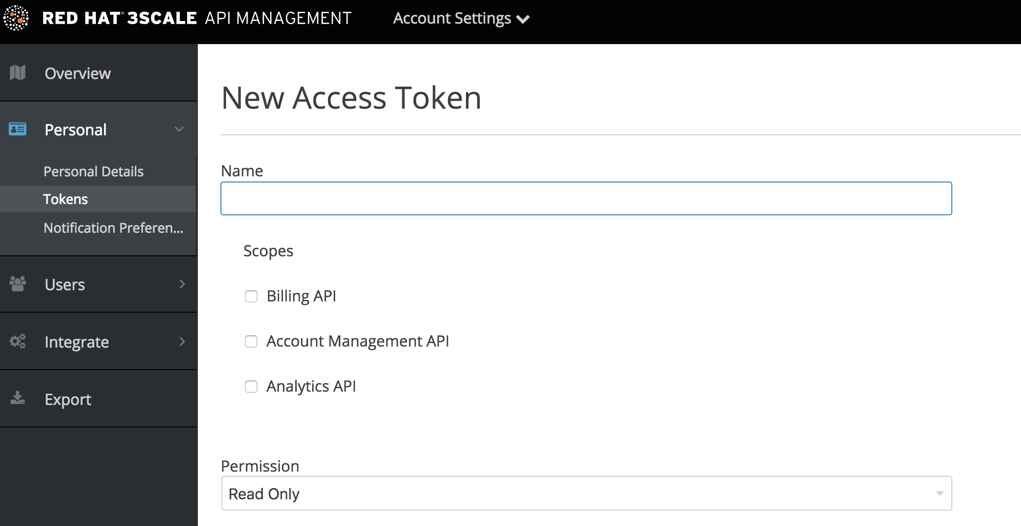 필요한 만큼의 액세스 토큰을 생성할 수 있지만 보안상의 이유로 3scale에 저장되지 않습니다. 새 토큰을 만들 때 토큰을 저장하라는 경고 메시지가 표시되므로 이 토큰을 사용하여 3scale API에 요청할 수 있습니다. 토큰이 손실되면 삭제하는 것이 좋습니다.이를 삭제하면 비활성화되고 유효하지 않게 렌더링됩니다. 새 토큰을 만드는 것이 좋습니다.