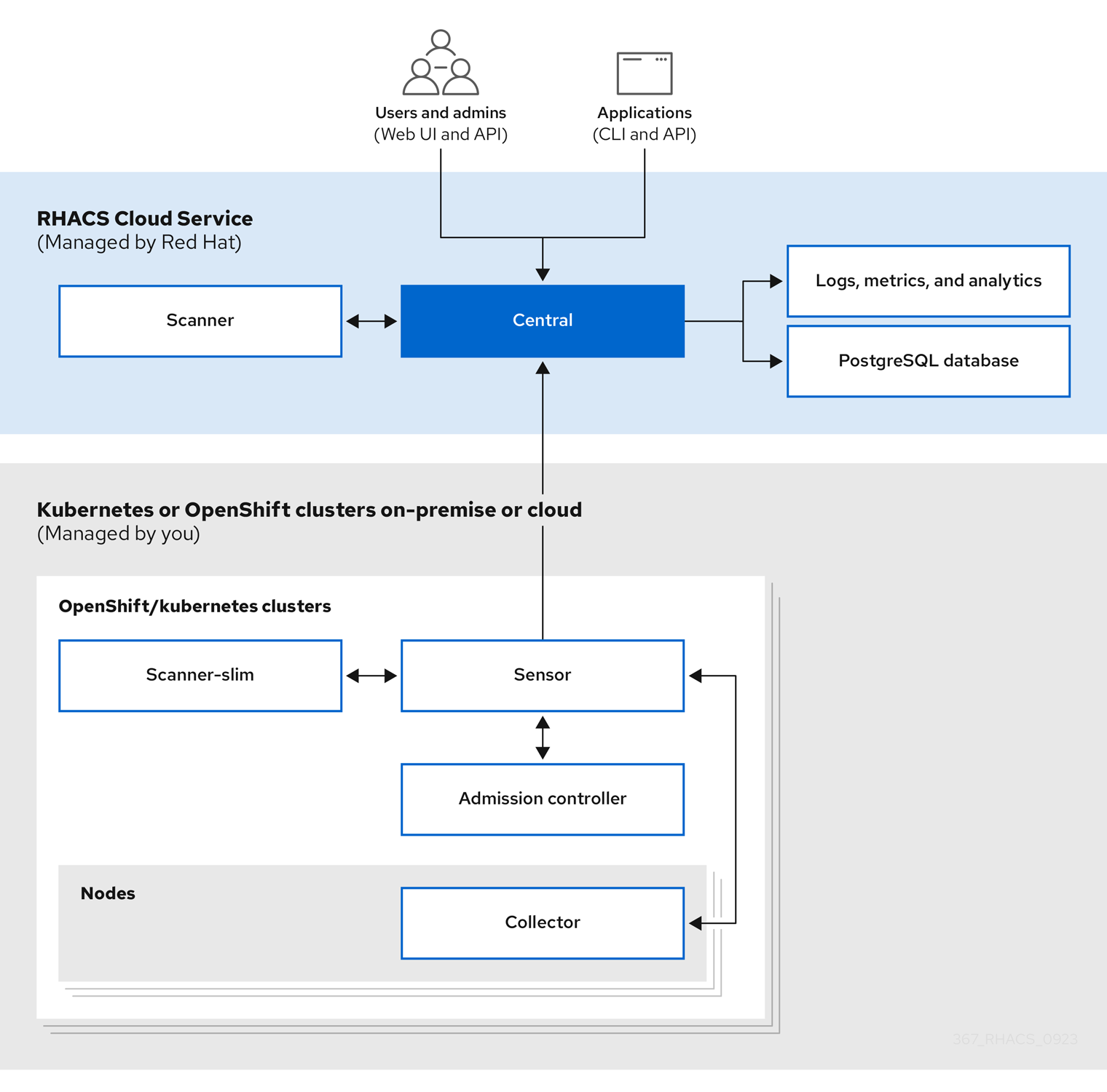RHACS 클라우드 서비스를 사용하면 중앙 인스턴스와 통신하는 자체 관리 클러스터를 보호할 수 있습니다. 보안 클러스터라는 클러스터는 Red Hat이 아닌 사용자가 관리합니다. 보안 클러스터 서비스에는 런타임 모니터링 및 컴플라이언스에 사용되는 선택적 취약점 검사 서비스, 승인 제어 서비스, 데이터 수집 서비스가 포함됩니다. 보안하려는 OpenShift 또는 Kubernetes 클러스터에 Secured 클러스터 서비스를 설치합니다.
