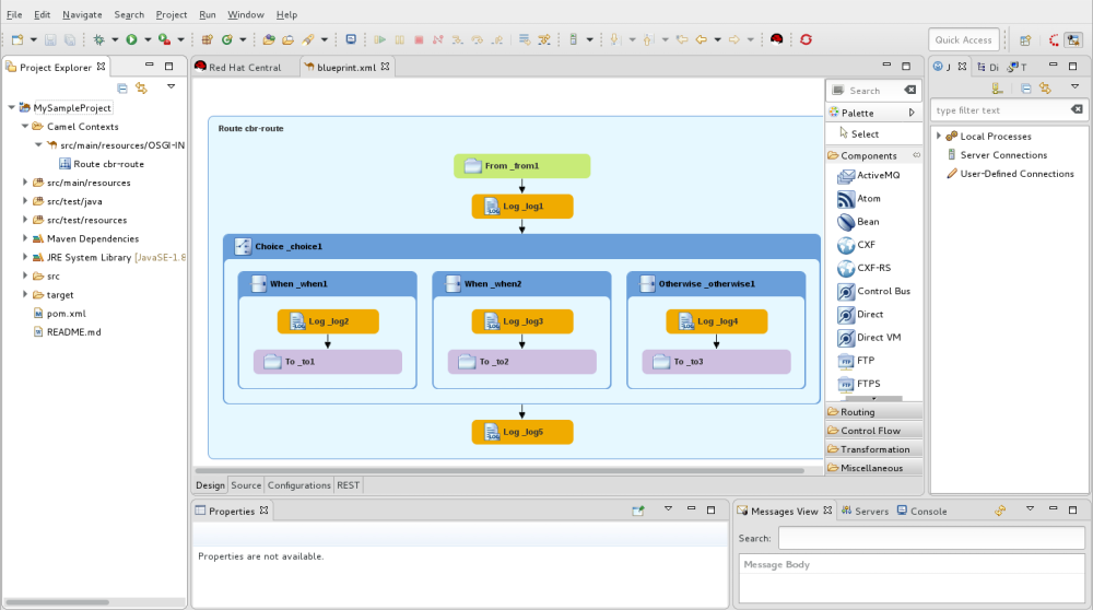 • 컨텐츠 기반 라우터 - 특정 위치에서 파일을 읽고 메시지 콘텐츠에 따라 다른 출력 폴더로 라우팅하는 샘플 Camel 경로를 제공합니다.
