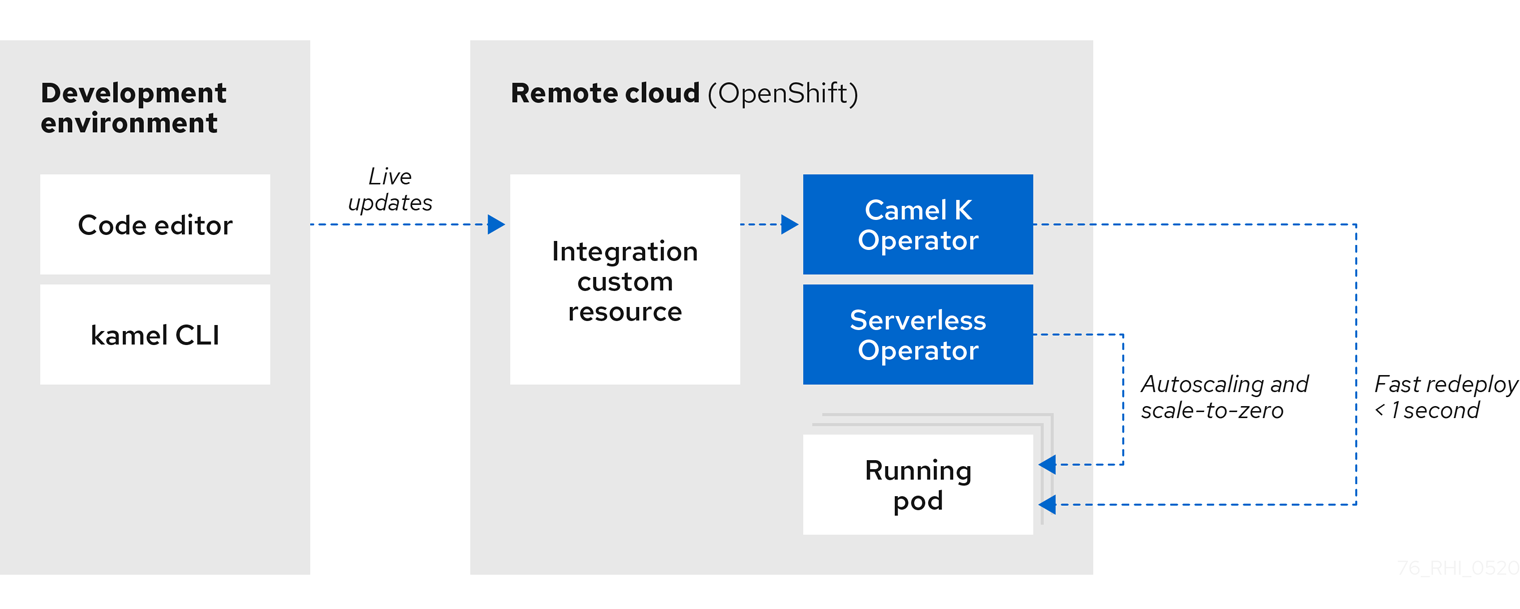 다음 다이어그램에서는 Camel K 클라우드 네이티브 아키텍처의 단순화된 보기를 보여줍니다.