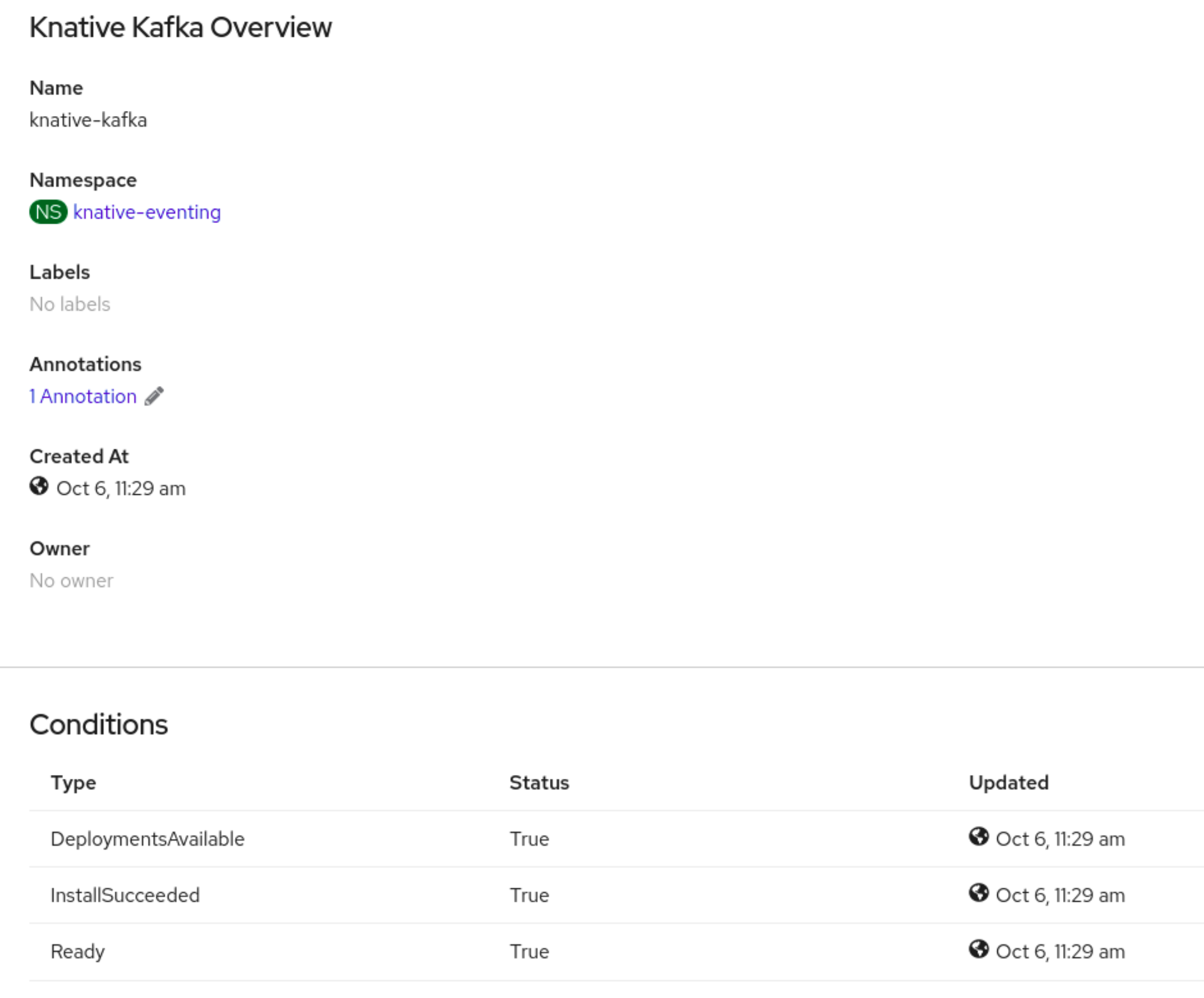 - Knative Kafka 탭에서 knative-kafka 리소스를 클릭합니다. 그러면 자동으로 Knative Kafka 개요 페이지로 이동합니다.