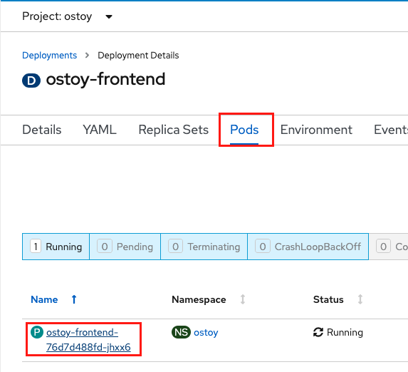 웹 콘솔에서 포드 > ostoy-frontend-xxxxxxx-xxxx 를 클릭하여 Pod 화면으로 변경합니다.