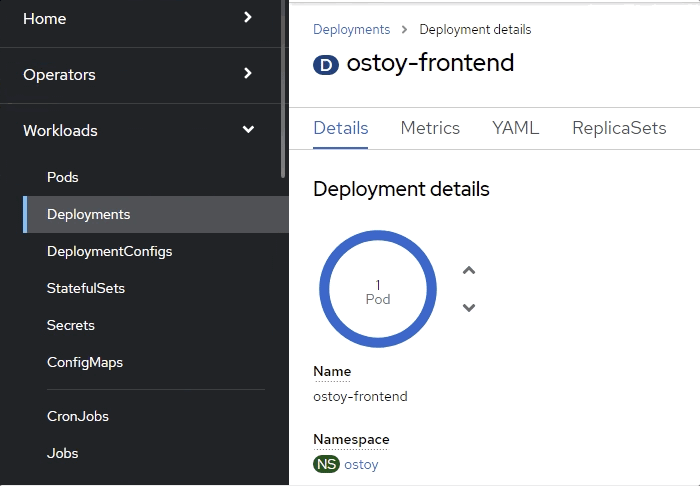 OpenShift 웹 콘솔에서 워크로드 > 배포 > ostoy-frontend 를 선택하여 OSToy 배포를 확인합니다.