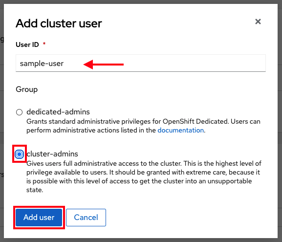 의 경우 :rosa grant user dedicated-admin --user <idp_user_name> --cluster=<cluster-name>