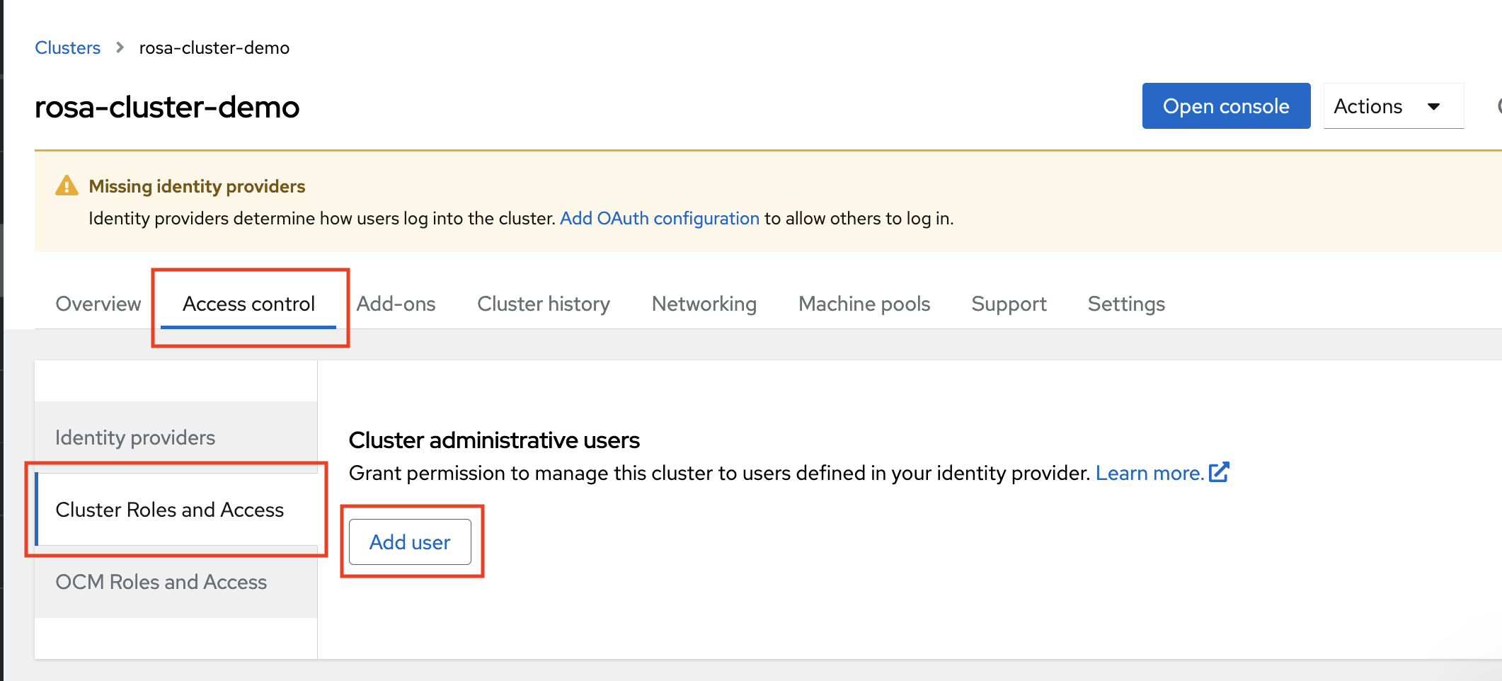 의 경우:rosa grant user cluster-admin --user <idp_user_name> --cluster=<cluster-name>