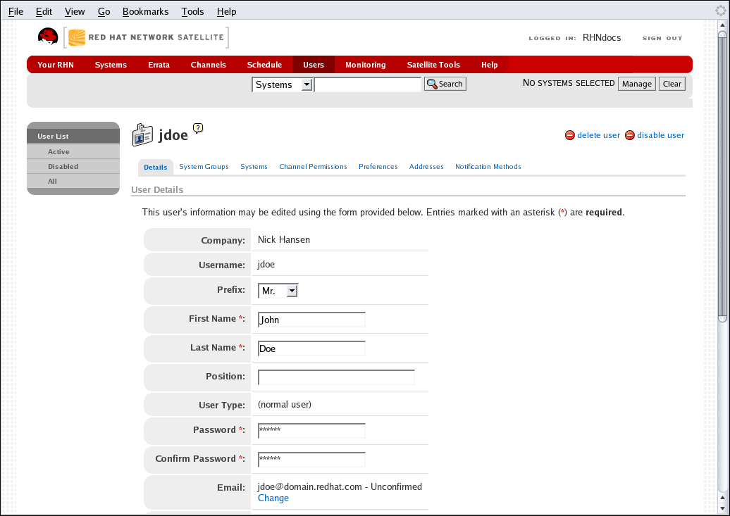 Há muitas outras opções para administrar usuários. Você pode encontrar as instruções destas no capítulo site do RHN do Guia de Referência do RHN.