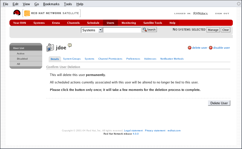 Por causa do ambiente isolado, no qual os RHN Satellites operam, os clientes Satellite possuem a capacidade de apagar usuários. Para acessar esta funcionalidade, clique em Users na barra de navegação superior do site do RHN. Na User List (Lista de Usuários) resultante, clique no nome do usuário a remover. Isso o levará à página User Details (Detalhes do Usuário). Clique no link delete user no canto superior direito da página.