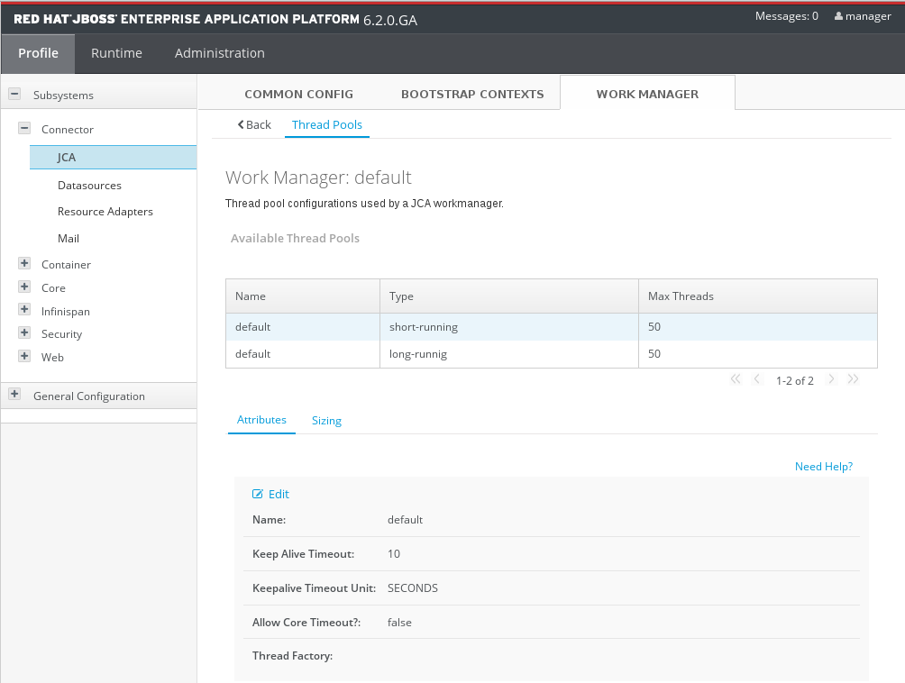 Work Manager 标签页包含配置的 Work Manager 的列表。您可以新建、删除 Work Manager 以及配置线程池。每个 Work Manager 都可以有一个短期运行以及一个长期运行的的线程池。图 21.2. Work Managers