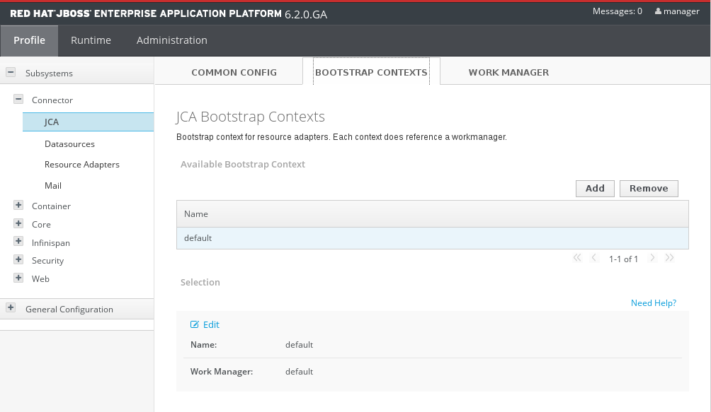 Bootstrap Contexts 标签页包含了 Bootstrap Contexts 列表。您可以创建、删除和配置 Bootstrap Context。每个 Bootstrap Context 都必须分配一个 Work Manager。图 21.4. Bootstrap Contexts