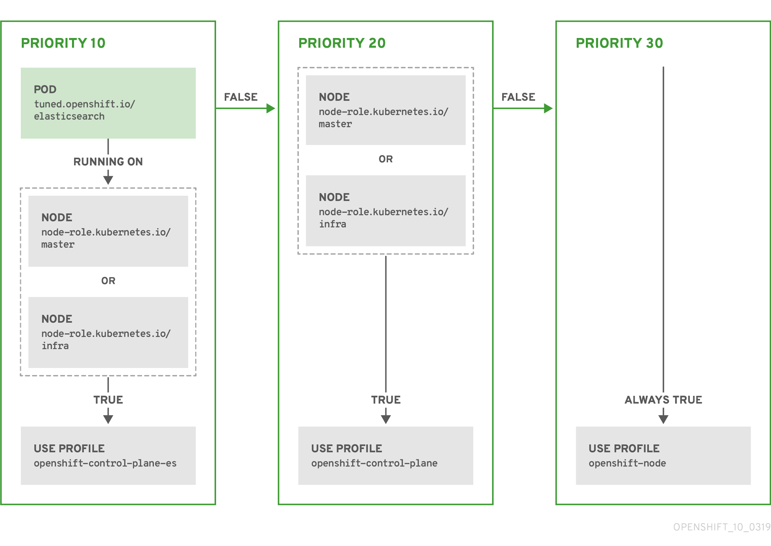如果这些标签对优先级为 10 的配置集而言匹配,则应用 openshift-control-plane-es 配置集,并且不考虑其他配置集。如果节点/pod 标签组合不匹配,则考虑优先级第二高的配置集 (openshift-control-plane)。如果容器化 TuneD Pod 在具有标签 node-role.kubernetes.io/master 或 node-role.kubernetes.io/infra 的节点上运行,则应用此配置集。