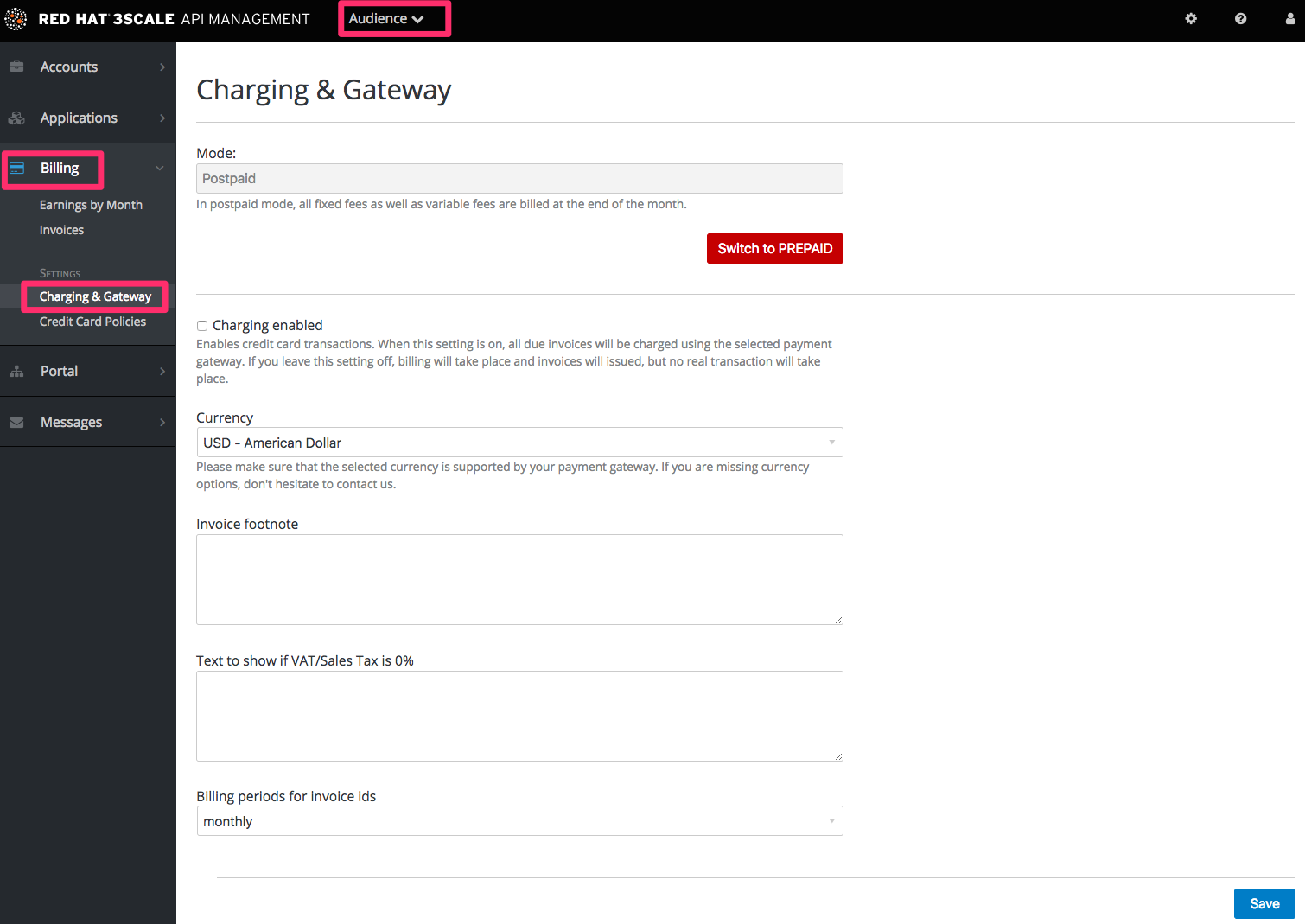 - 在 Audience > Billing > Charging & Gateway 中,选中该框并点 Save 来启用计费。