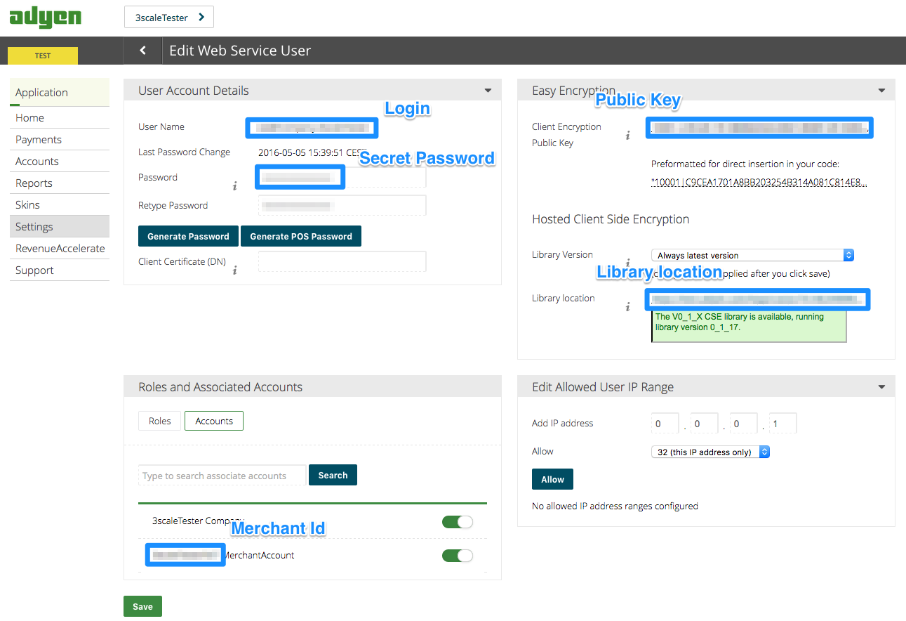 - 最后,您可以访问 3scale 账单设置所需的 登录名、机密密码、客户端加密公钥、Merchant ID 和库位置。
