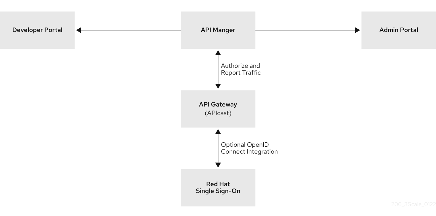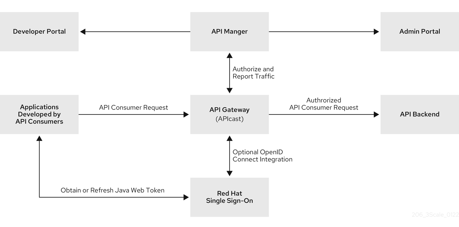 - 如果 3scale 管理的 API 没有使用标准 API 密钥或应用程序标识符和密钥对验证请求,那么 API 供应商必须与 OpenID Connect 身份提供程序集成。在下图中,OpenID Connect 身份提供程序是红帽单点登录。
