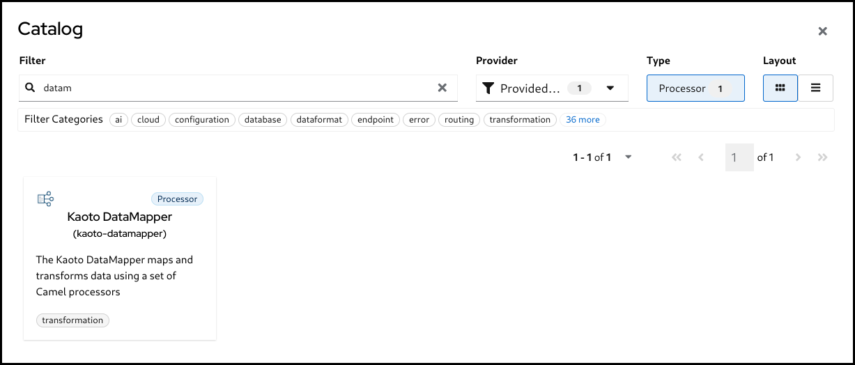 ,或替换 Kaoto Design 视图中的步骤时,您可以在目录中找到 Kaoto DataMapper 步骤。