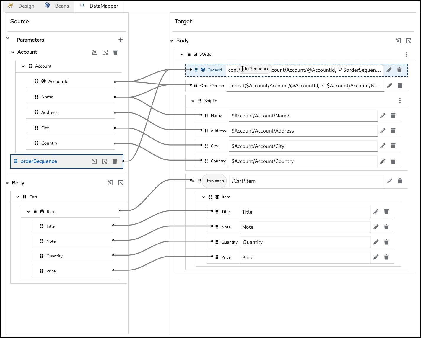 目前,DataMapper 只支持 XML 模式来渲染数据结构,并在内部生成一个 XSLT 步骤来在运行时执行配置的数据映射。虽然您可以使用映射到 XSLT 参数的 Camel 变量和/或 Message Headers 来消耗多个 XML 文档,但输出只是 Camel 消息正文。