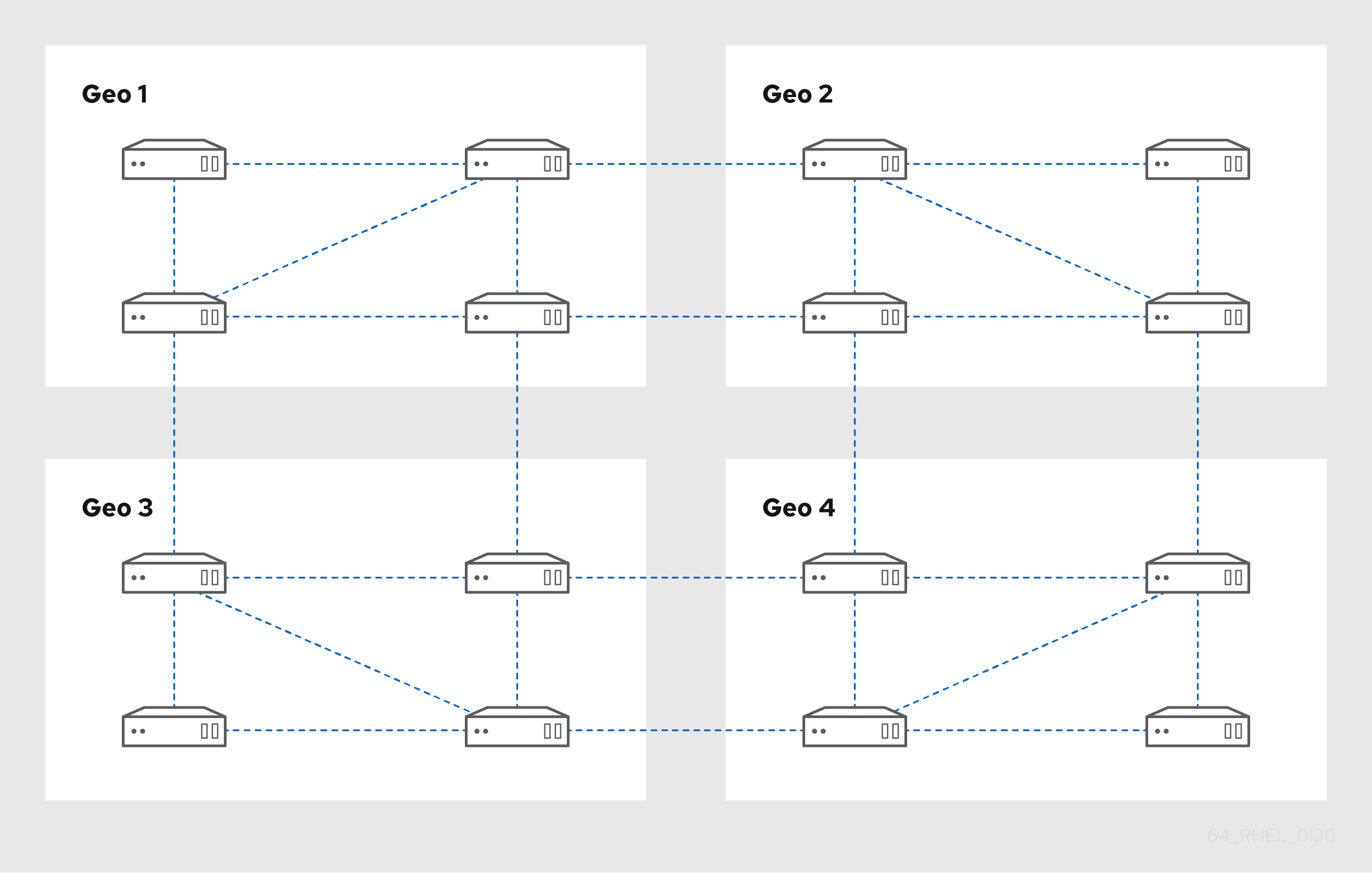 3.5. 副本拓扑示例 您可以使用以下示例之一创建一个可靠的副本拓扑。 图 3.2. 具有四个数据中心的副本拓扑,每个数据中心有四个使用复制协议连接的服务器 View larger image 图 3.3. 具有三个数据中心的副本拓扑,每个数据中心都有不同数量的服务器,它们通过复制协议互连 View larger image 前一个下一个
